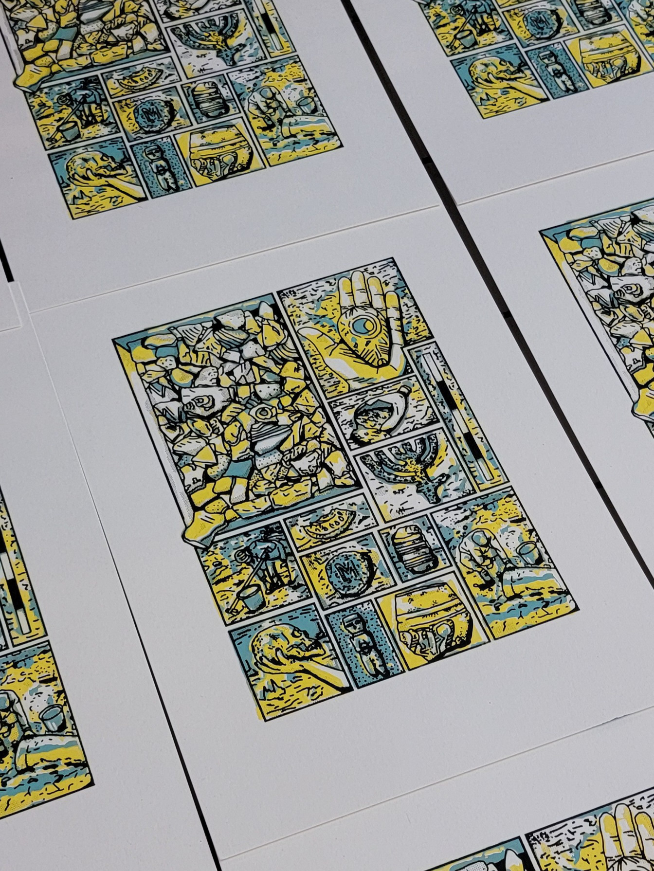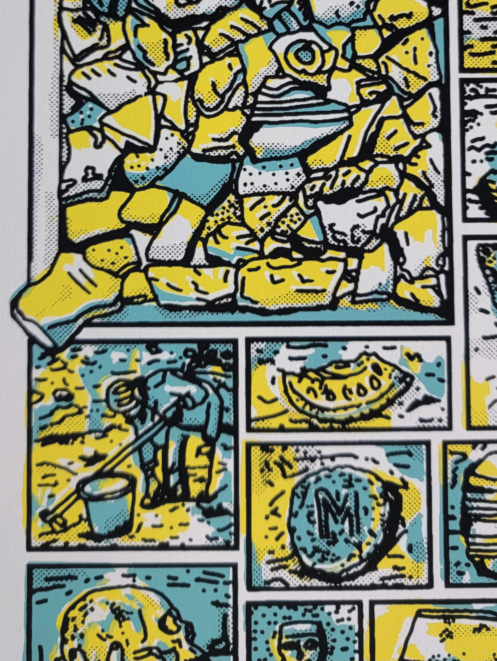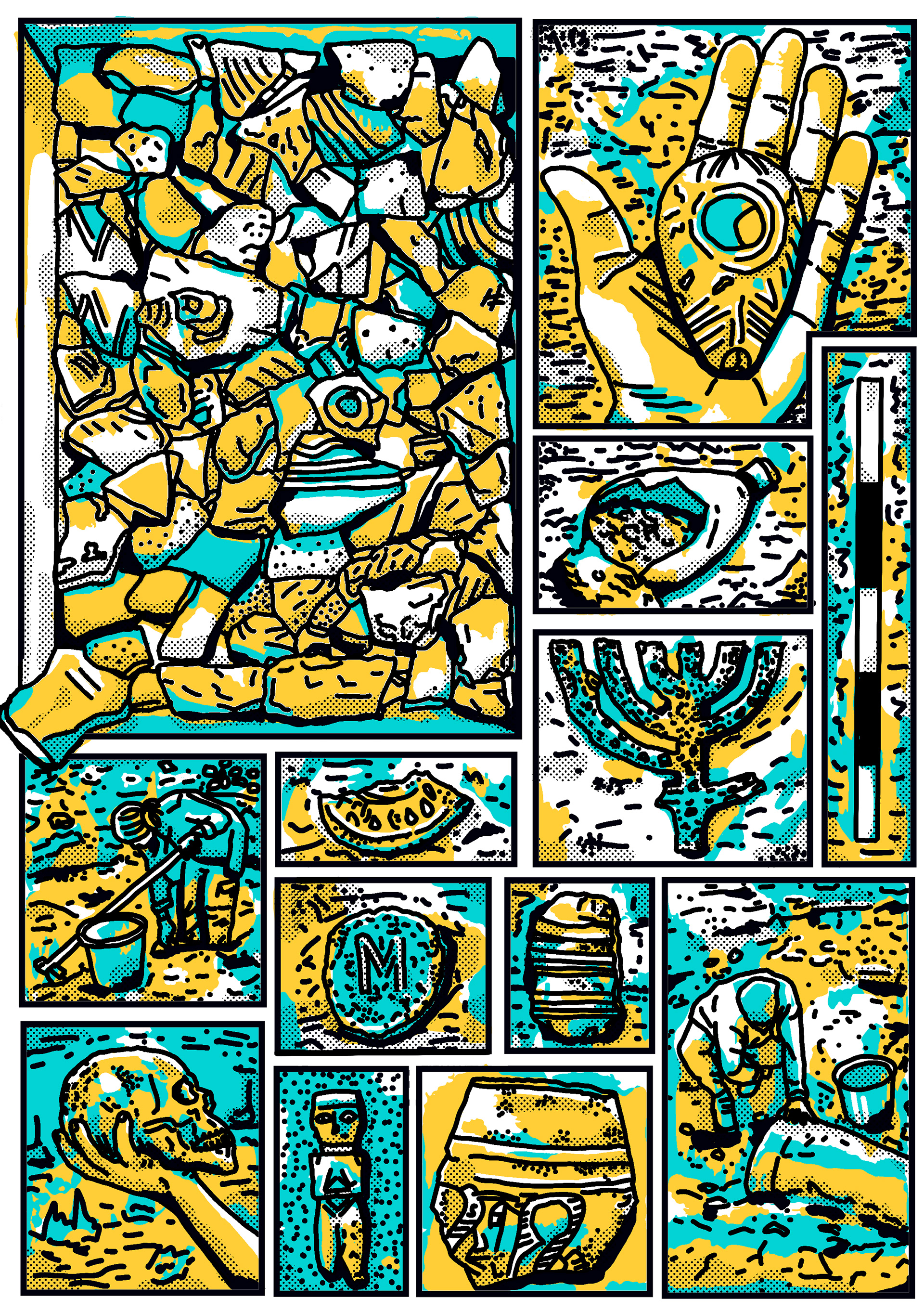 This print was created for an exhibition exploring the archeological heritage of Jaffa. Inspired by the findings of my friend, archaeologist Nissim Zeitoune, I designed the artwork in a comic-book layout that showcases various artifacts uncovered around Jaffa and Israel, from ancient coins, menorahs, pottery shards and even skulls. Each artifact tells a piece of Jaffa’s story as a crossroads of civilizations for over 5,000 years.