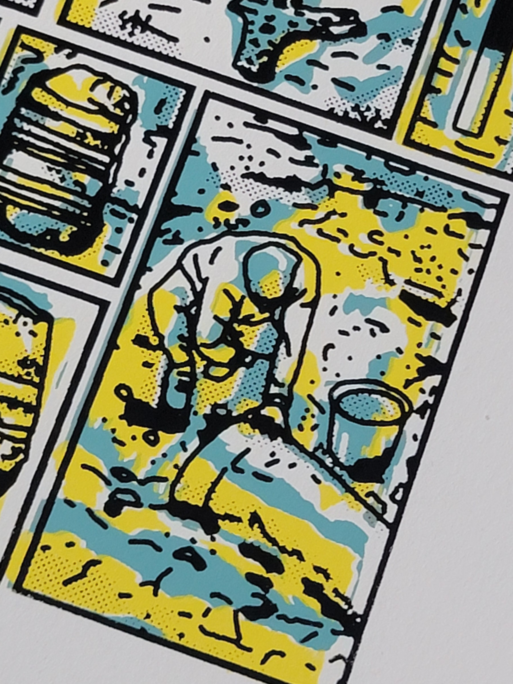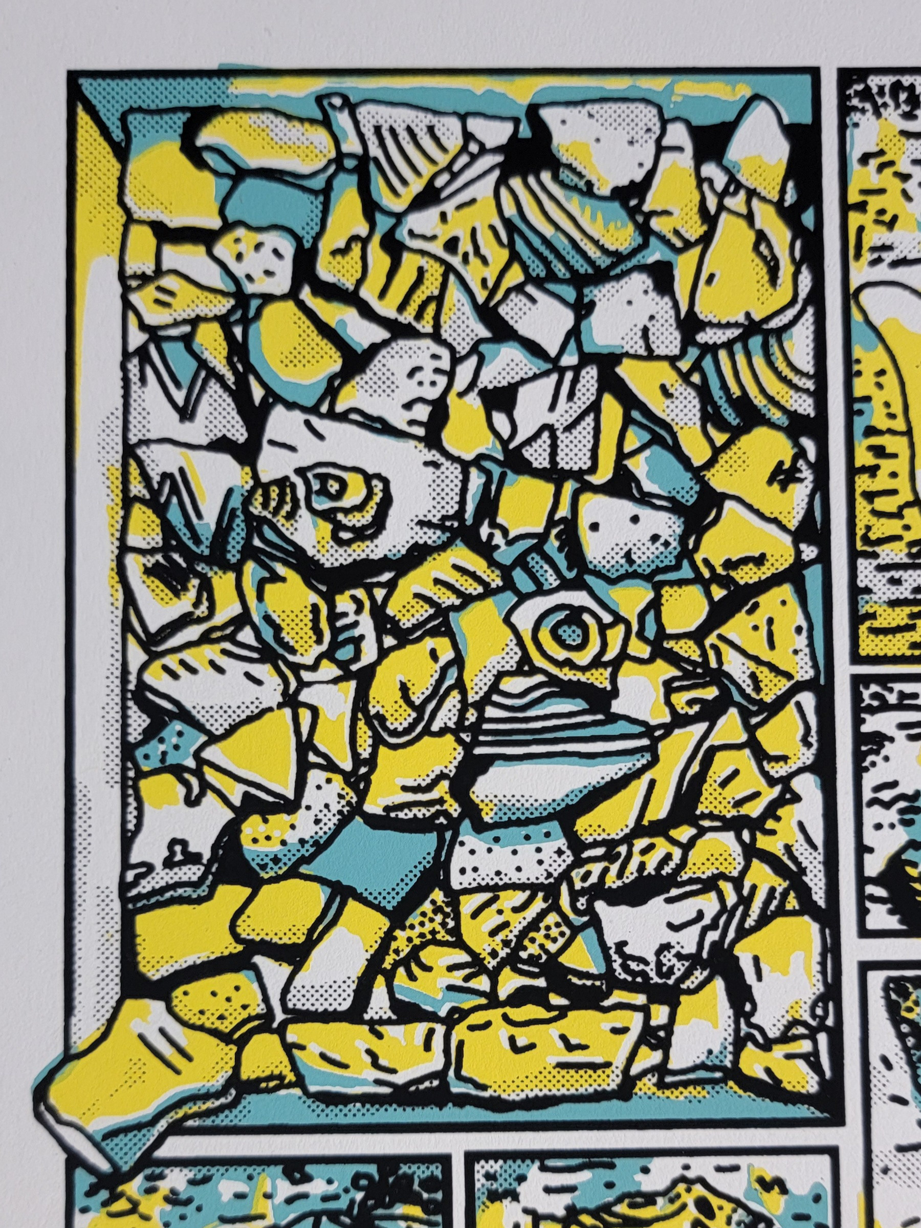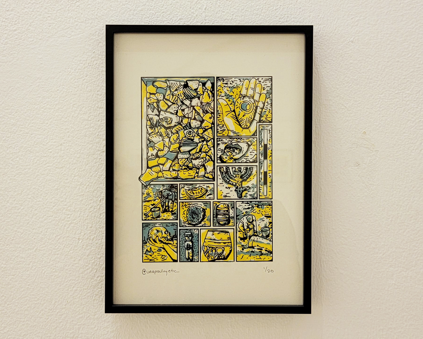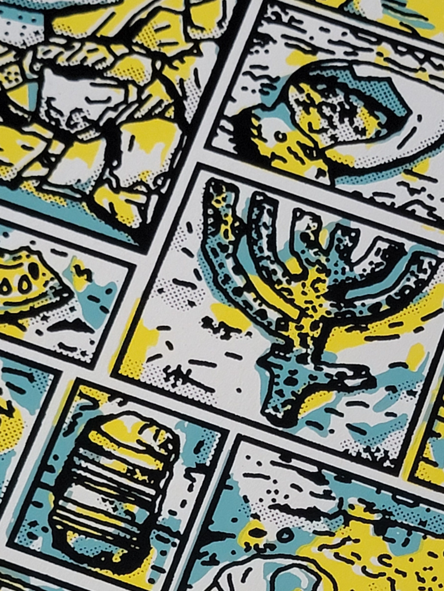 This print was created for an exhibition exploring the archeological heritage of Jaffa. Inspired by the findings of my friend, archaeologist Nissim Zeitoune, I designed the artwork in a comic-book layout that showcases various artifacts uncovered around Jaffa and Israel, from ancient coins, menorahs, pottery shards and even skulls. Each artifact tells a piece of Jaffa’s story as a crossroads of civilizations for over 5,000 years.